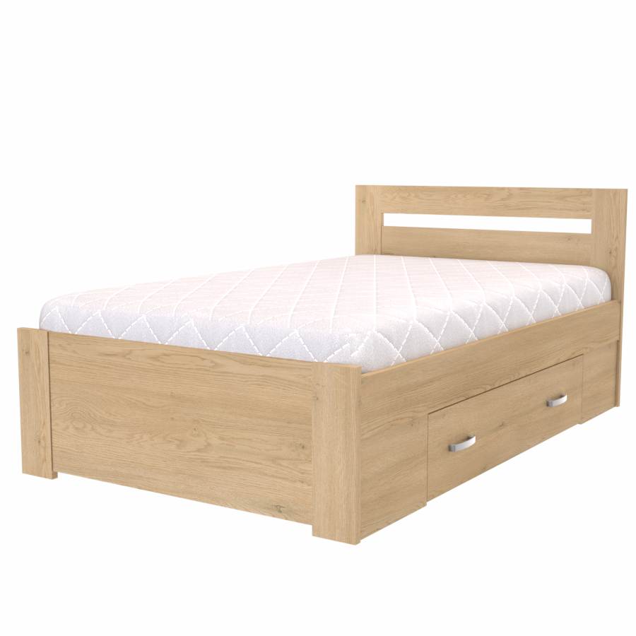 • Rovné provedení s jedním zvýšeným čelem a dvěmi zásuvkami (zásuvky na kolečkách na obou stranách postele)